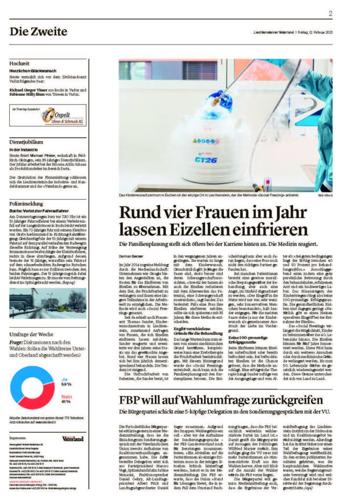 Seit da erhielt auch Frauenarzt Thomas Sander, Kinderwunschzentrum in Liechtenstein, zunehmend Anfragen von Frauen, die sich Eizellen einfrieren lassen möchten. San der reagierte und erwei terte vor drei Jahren seine Praxis um das gewünschte Angebot. Rund vier Frauen lassen sich bei ihm jährlich dementsprechend behandeln. Die Tendenz ist steigend.